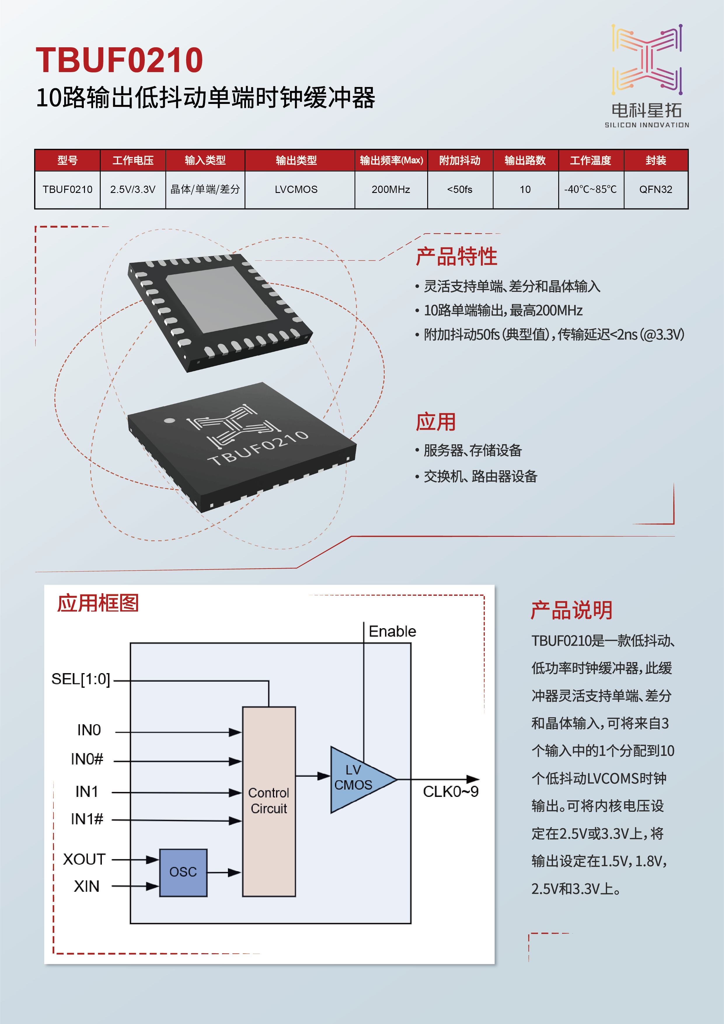 TBUF0210 is a clock buffer with low jitter and low power consumption, which flexibly supports single-end, differential, and crystal inputs. It can distribute 1 of 3 inputs to 10 low-jitter LVCOMS clock outputs and can set the core voltage to 2.5V or 3.3V and the output voltage to 1.5V, 1.8V, 2.5V, and 3.3V.